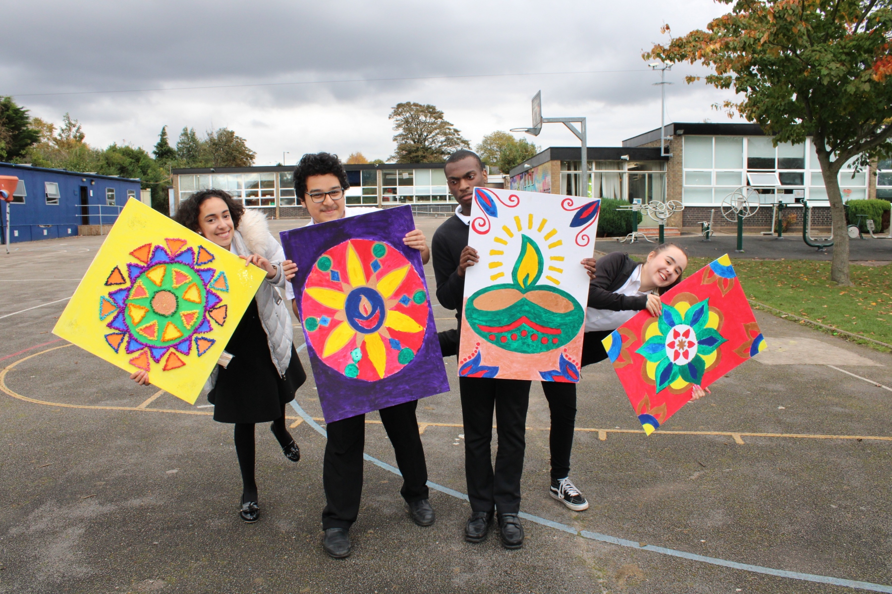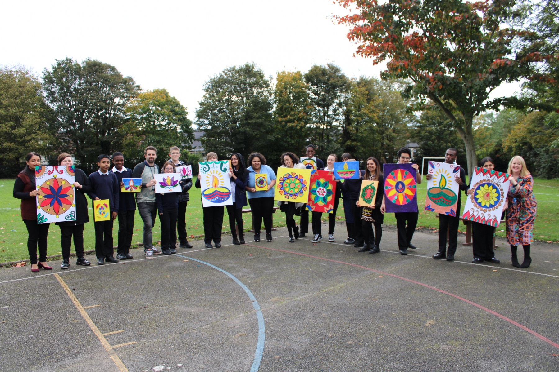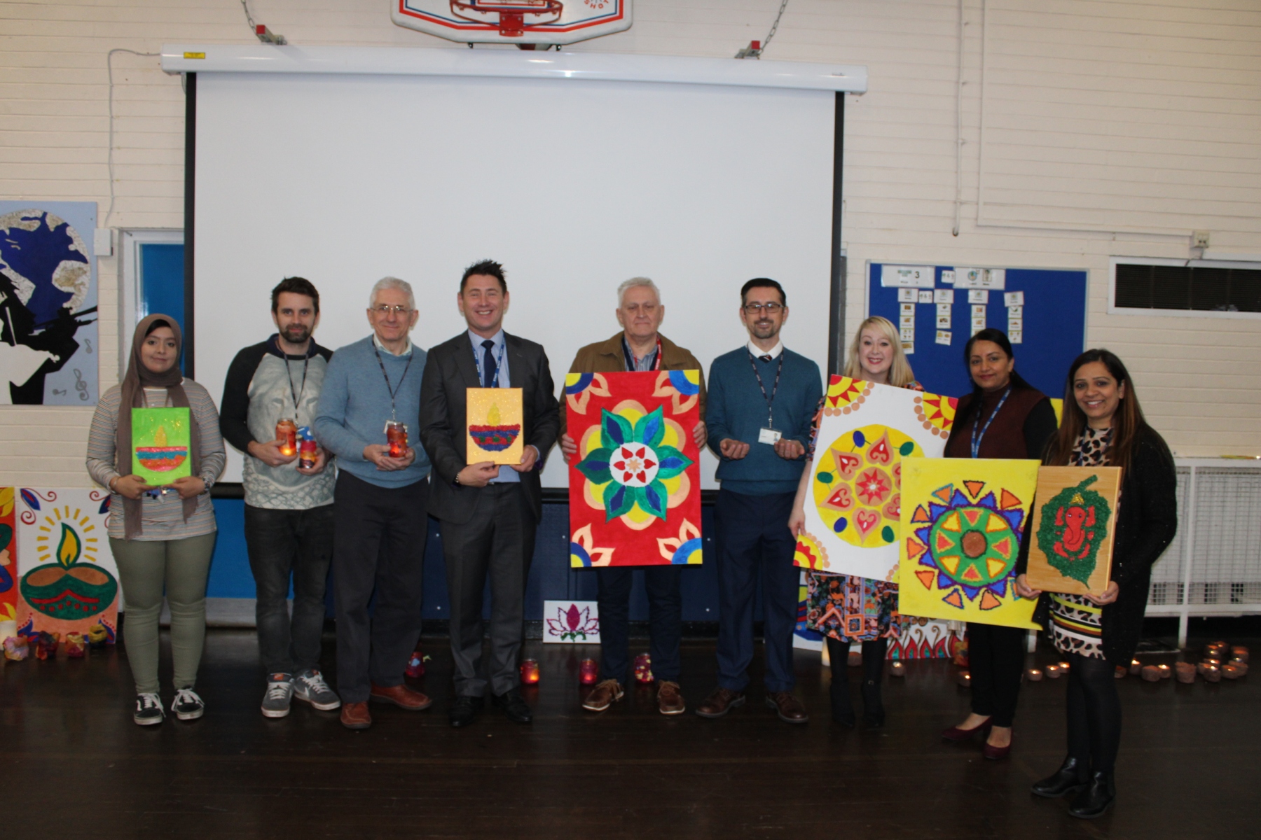 On Friday 19th October Queensbury School celebrated Diwali. Students created a range of beautiful art works including mixed media collage, acrylic canvas painting, clay tea lights, wire and tissue painting lanterns and Rangoli chalk art. Students had the option to have their hands decorated with Henna and samosas were on sale at break. I would like to say thank you to Local Councillor Mick Brown for coming here today to our assembly and awarding our pupils for their hard work.