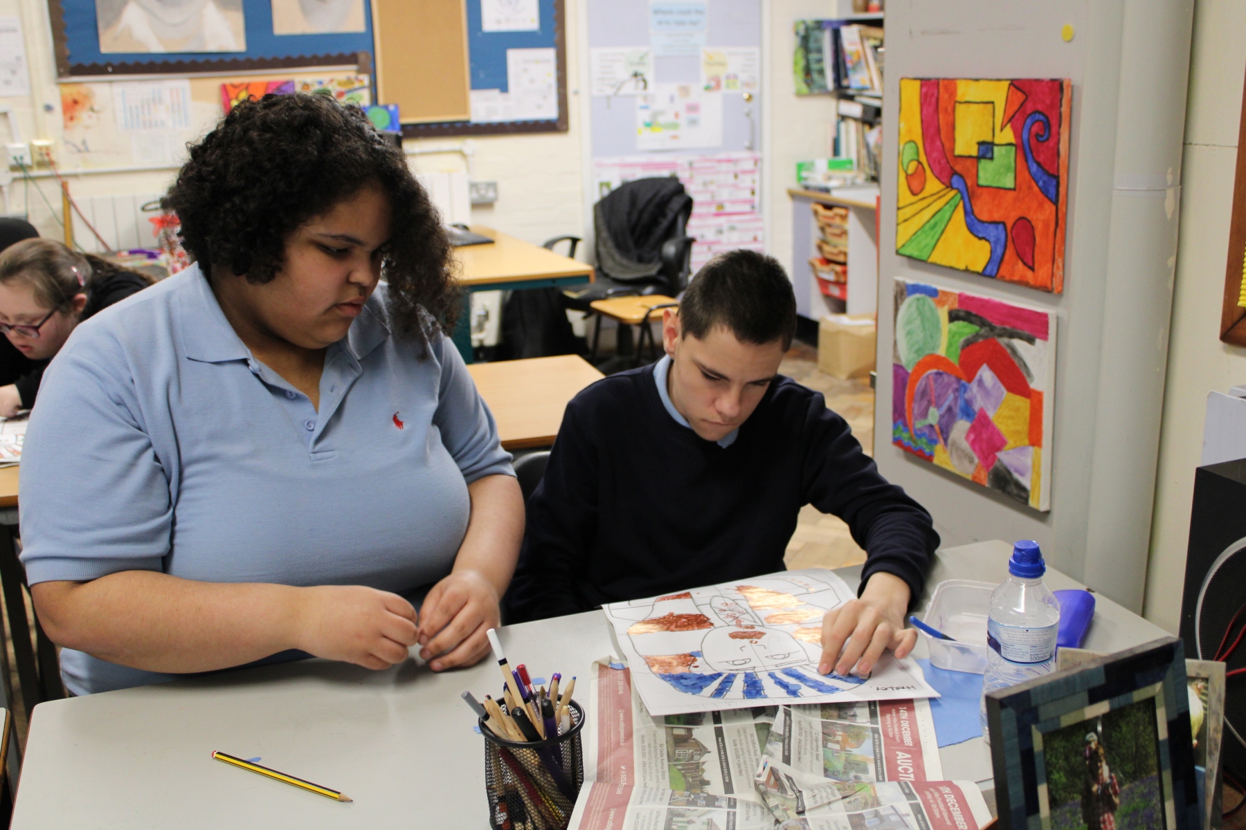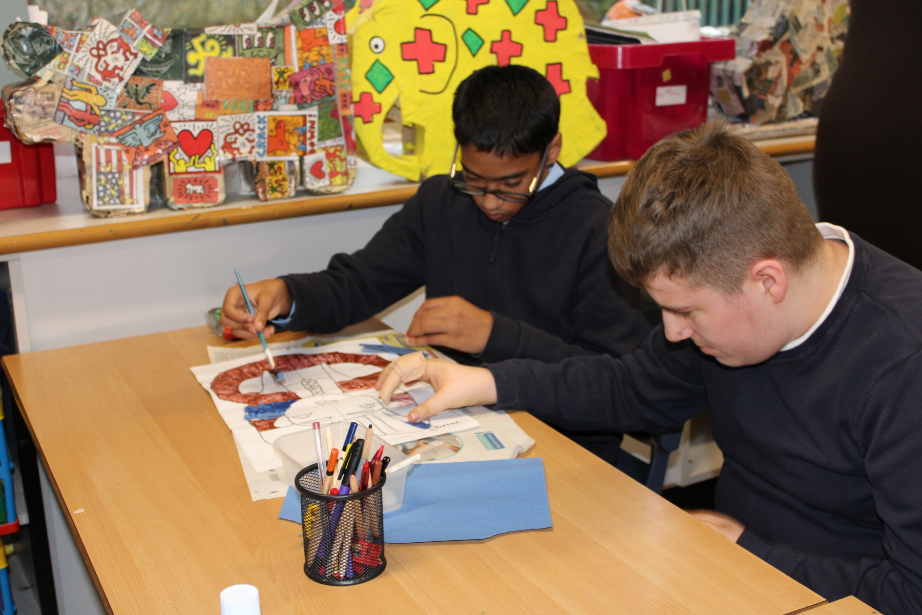 Students from 11E supported pupils in 3D today. They helped 3D students to make a collage for their Tutankhamun artwork. They did a fantastic job and were excellent role models.
