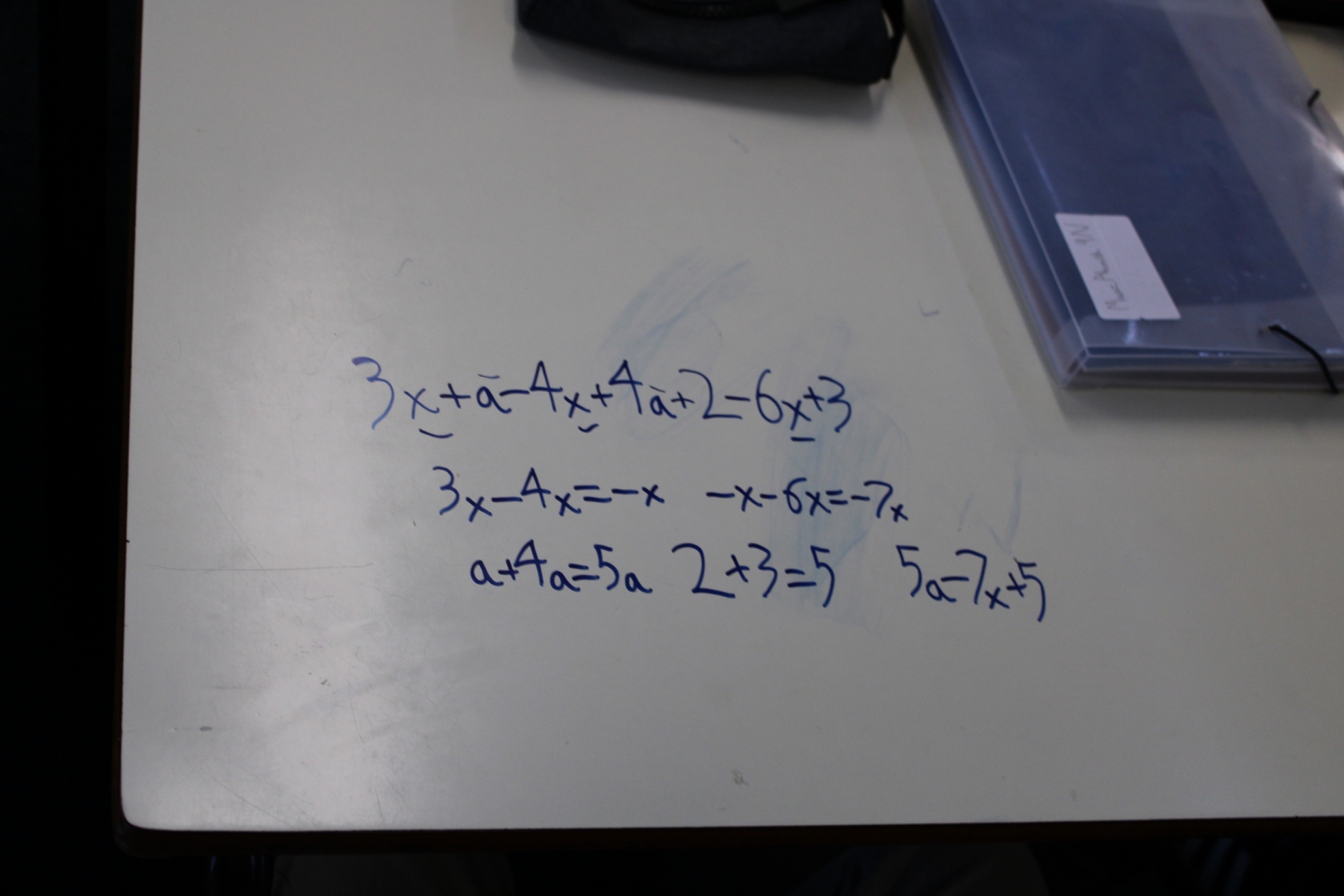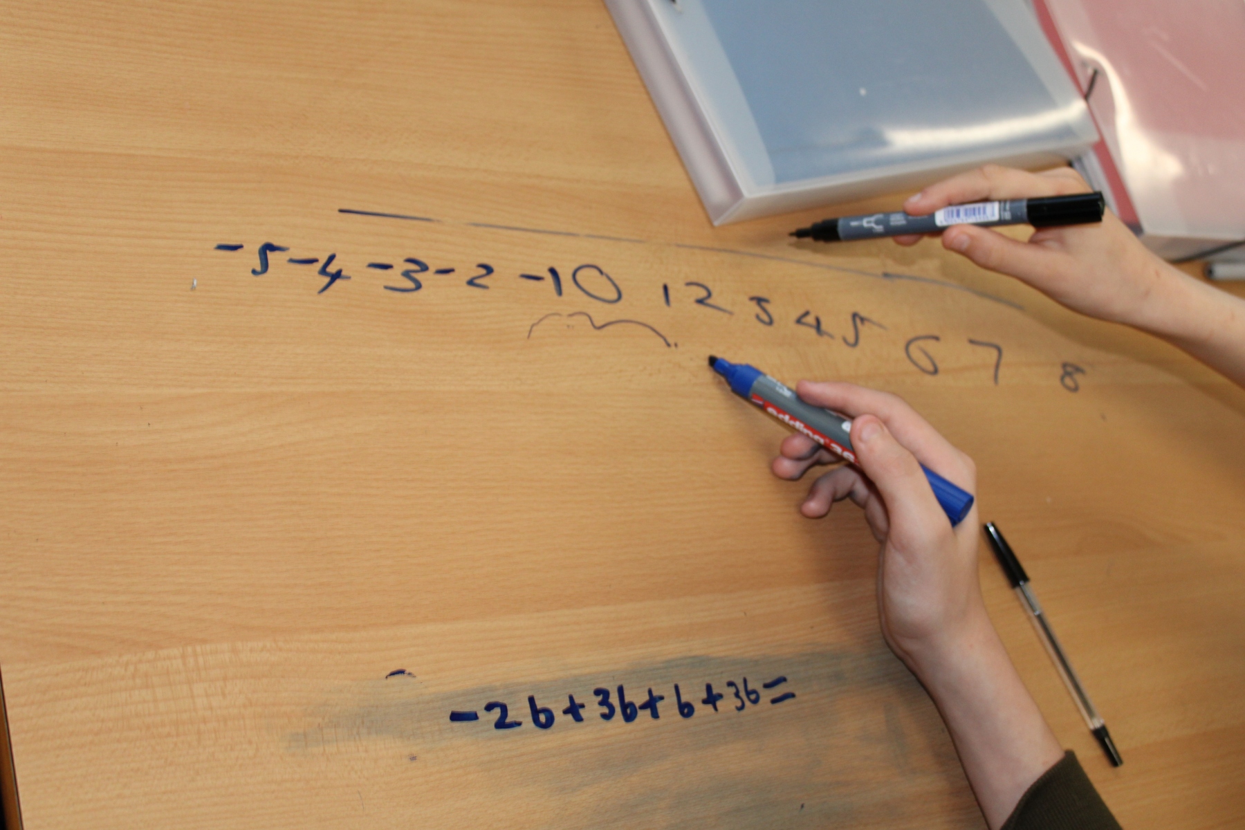 Year 9 are looking and collecting like terms and simplifying.  Half the group have created questions and the other half are creating number lines and writing their answer on the tables.