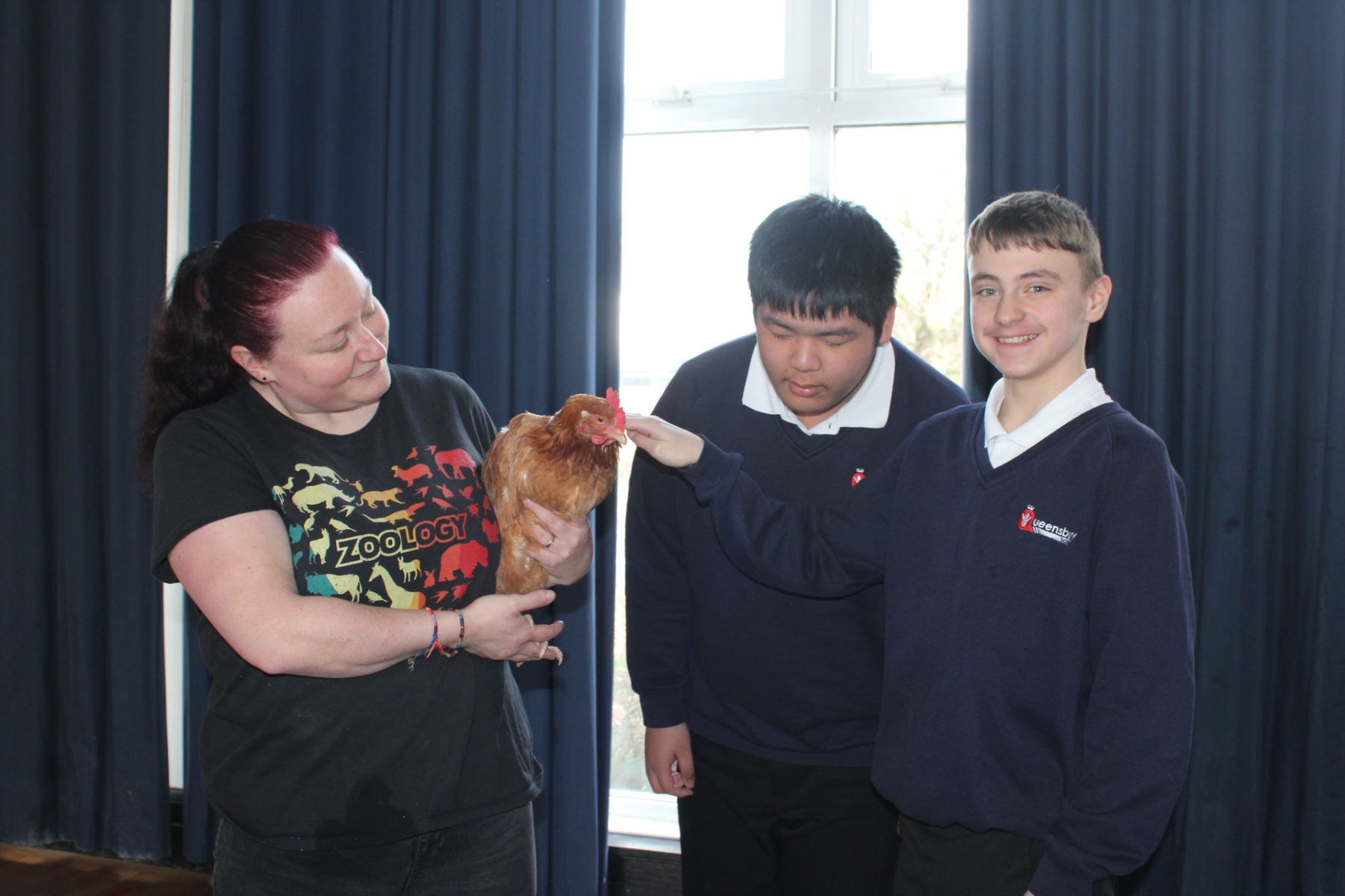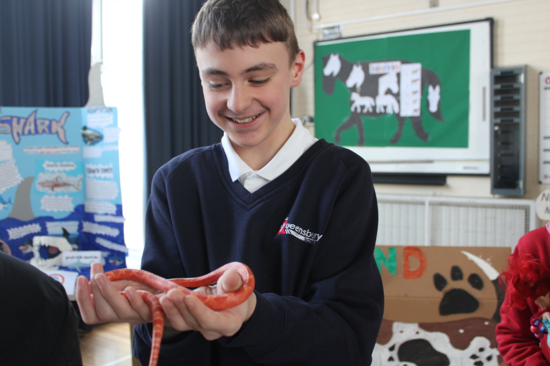 Queensbury students had an exciting experience during British Science Week 2025, themed “Change and Adapt,” where they got the chance to meet a variety of fascinating animals. Among the stars of the show were Millie the hissing cockroach, Cornflake the corn snake, Sarah the chicken, and Trixie the energetic sprocker spaniel.